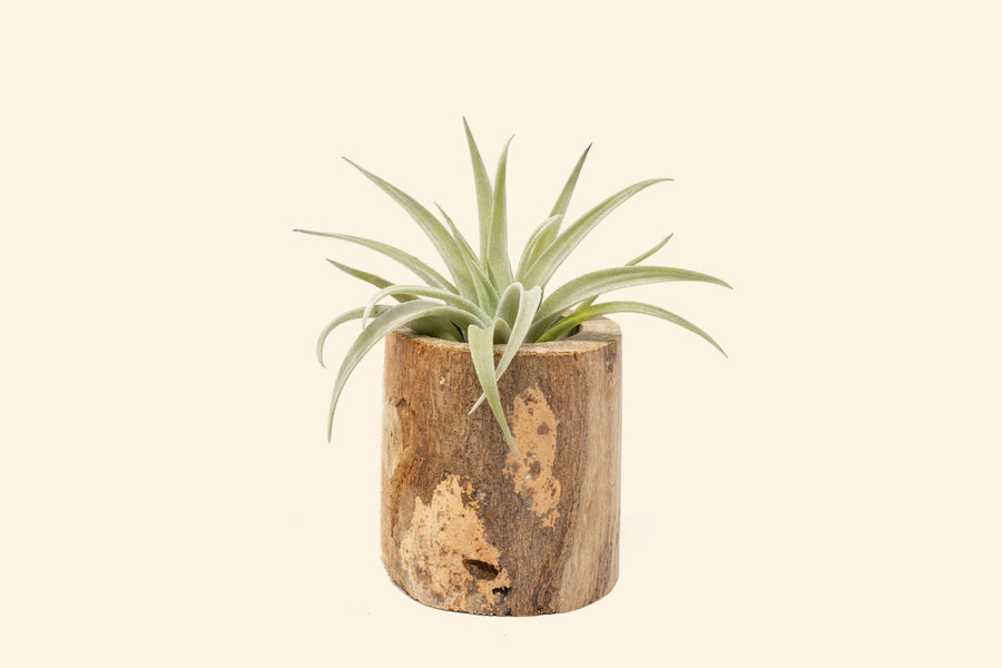 Our small driftwood containers, standing about 3 inches tall and 2.5 inches wide, are excellent vessels for our medium to larger tillandsias. One arrangement makes for a thoughtful earthy accessory or arrange them in threes or fives for centerpieces and table settings. Some cracks and slight variations in color will occur as they are a naturally sourced product.