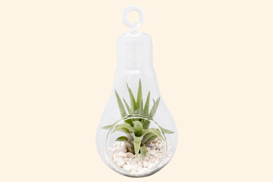 Our light bulb terrarium is a fun and modern way to display air plants. Each kit includes an assorted Tillandsia, crushed white stones, and a clear glass vessel. With its flat base and top hook, it can be hung or displayed on any surface. A bright and charming accent for home or office!