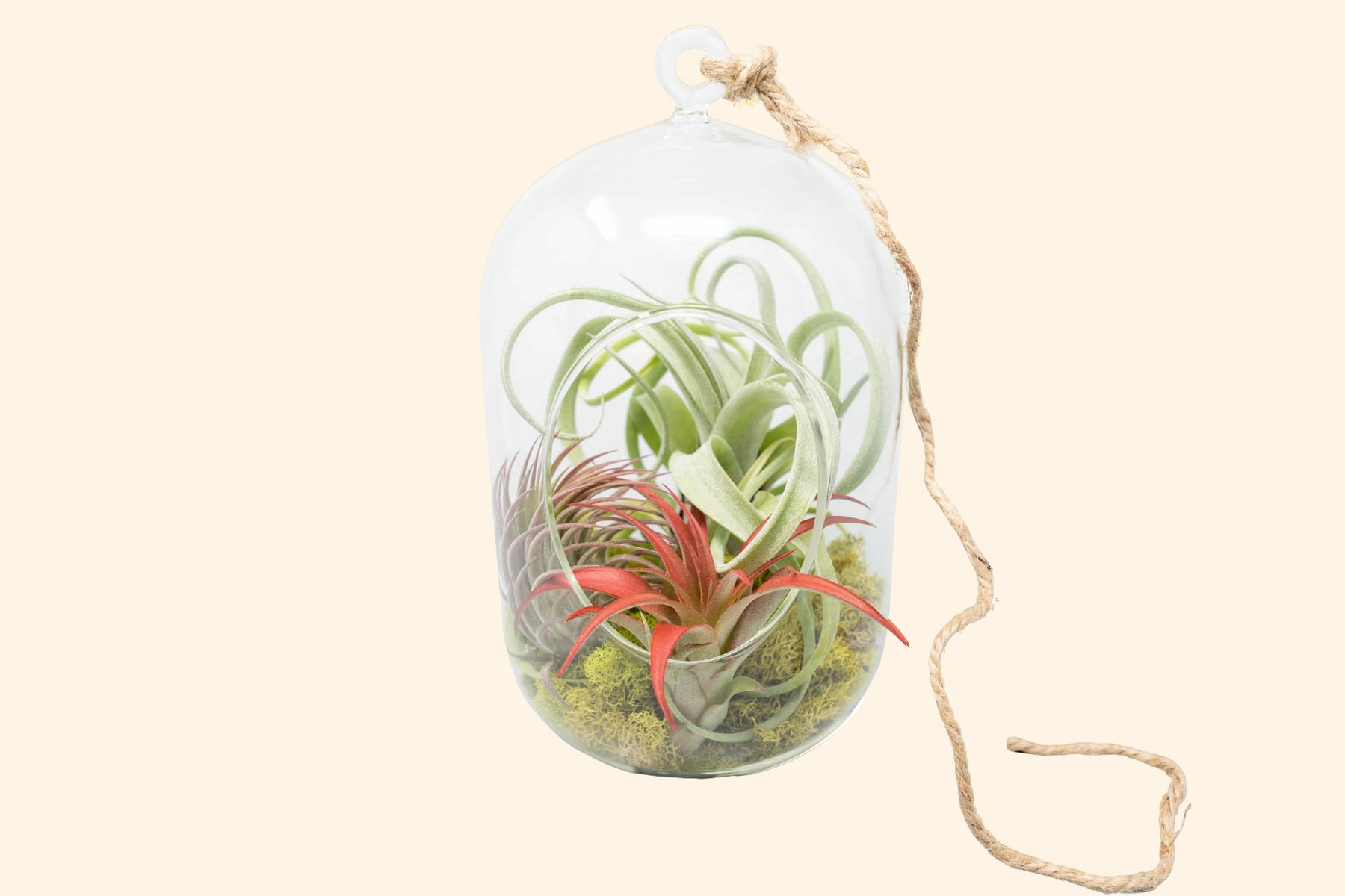 Our sleek glass capsule terrarium makes a stunning home for your air plants. Its tall, modern design is sure to catch the eye in any space. Display it by hanging from the loop with natural hemp string or place it on a tabletop or shelf. Each kit includes three assorted Tillandsia, decorative moss, and everything you need to create a beautiful display.