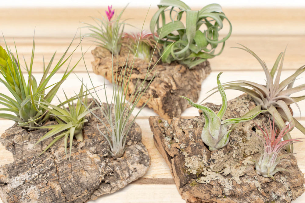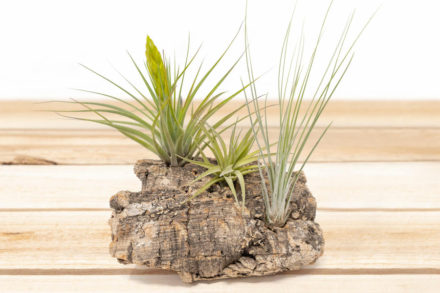 Air plants are included with this product. Our cork bark tabletop displays provide a simple and natural way to showcase air plants, reminiscent of their native habitat. Each display is designed with two strategically placed holes for securely positioning and wedging your air plants. Notably, these cork displays are unique for being completely glue-free, facilitating easy watering and rearrangement of the plants.