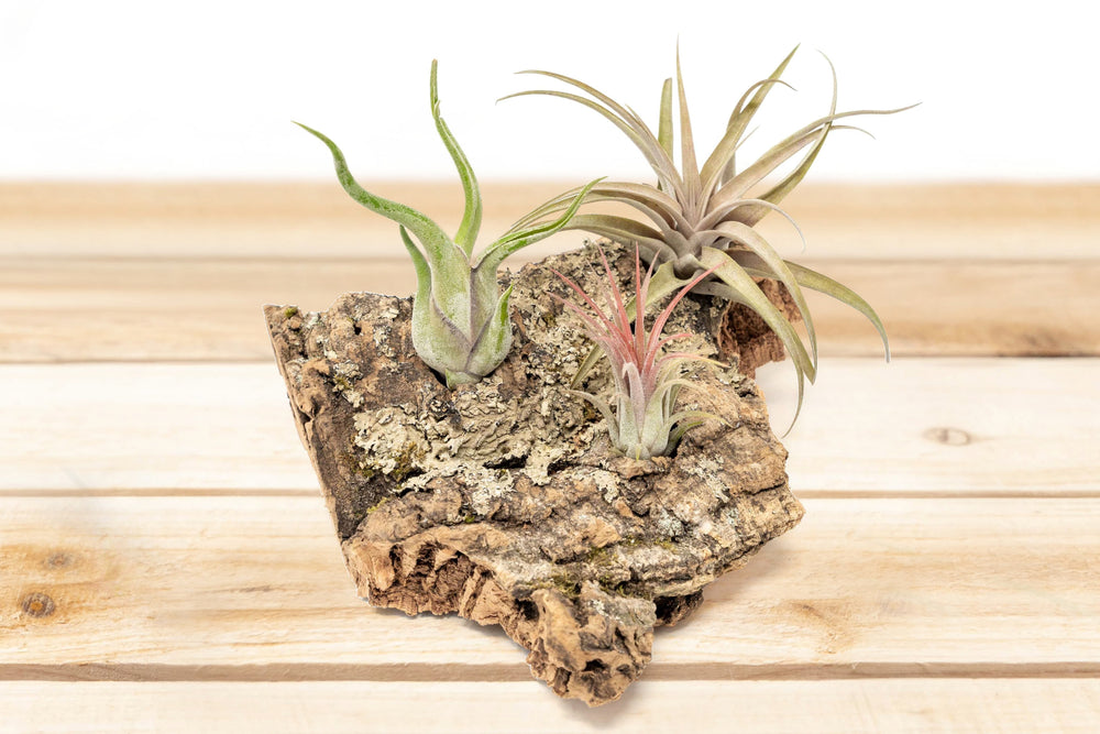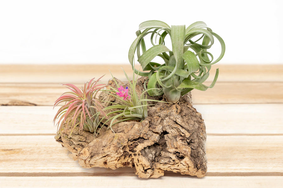 Air plants are included with this product. Our cork bark tabletop displays provide a simple and natural way to showcase air plants, reminiscent of their native habitat. Each display is designed with two strategically placed holes for securely positioning and wedging your air plants. Notably, these cork displays are unique for being completely glue-free, facilitating easy watering and rearrangement of the plants.