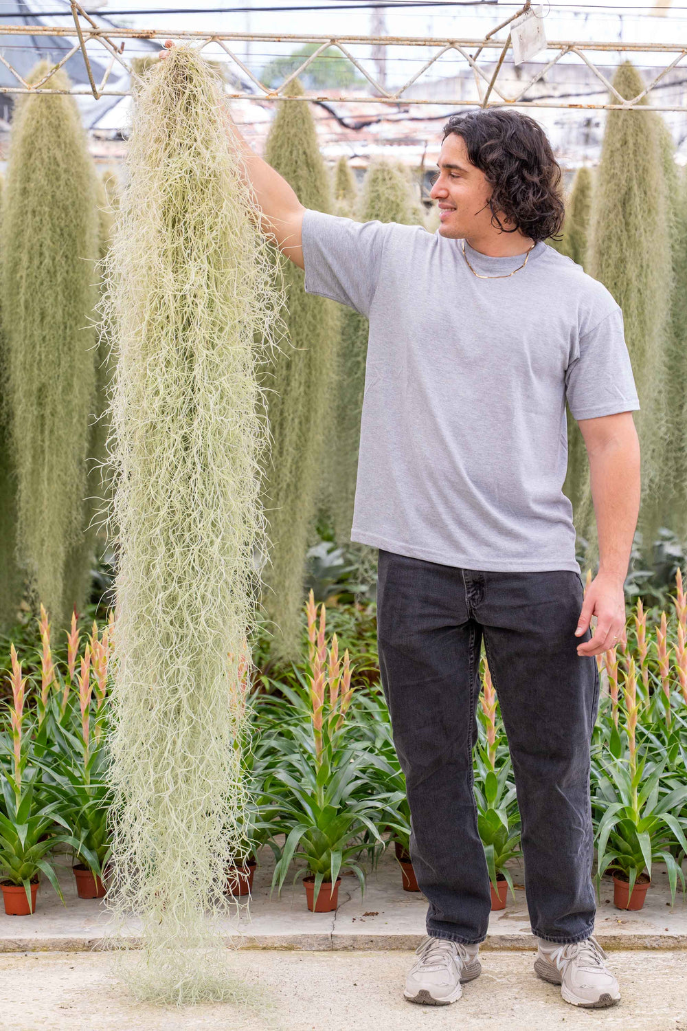 Our Extra Long Spanish Moss clumps are perfect for creating eye-catching displays in large spaces. Each clump measures over 6 feet long and features thick, vibrant silver tendrils that bring an elegant, organic feel to any setting. This variety is much fuller and more luminous than the common gray moss found in the Southern U.S., making it ideal for high-impact decorative use! In the American South, hang them from the ceiling of a pool enclosure, porch or from an Oak Tree.